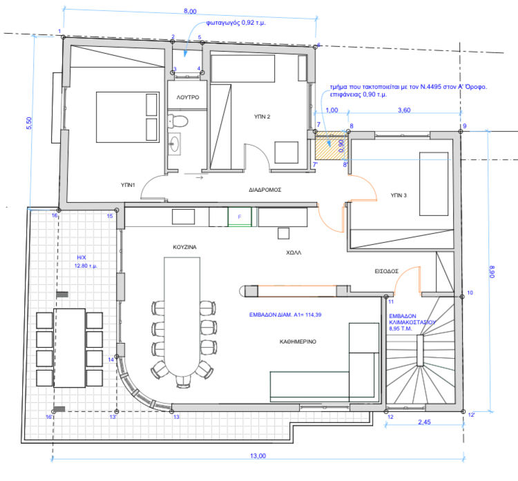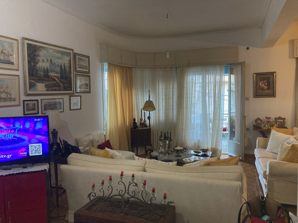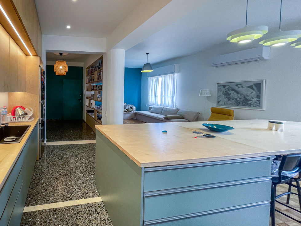 A 1965-built apartment in Heraklion gets a modern and simple touch. The originally divided-into-four-parts living space becomes the vital area of the apartment where everything takes place. The kitchen is moved from its former independent room—now freed—and becomes part of the living space. A vast working bench–island becomes the central gathering point. The old sliding doors that once separated the entrance hall from the living room were replaced by a built-in bookcase made of marine plywood. The new electrical installation was routed through the ceiling, allowing the preservation of the terrazzo floors—an artisanal craft that is slowly disappearing—as well as the oak wood flooring. With the slight lowering of the ceiling, recessed lighting was introduced, along with thermal and acoustic insulation.